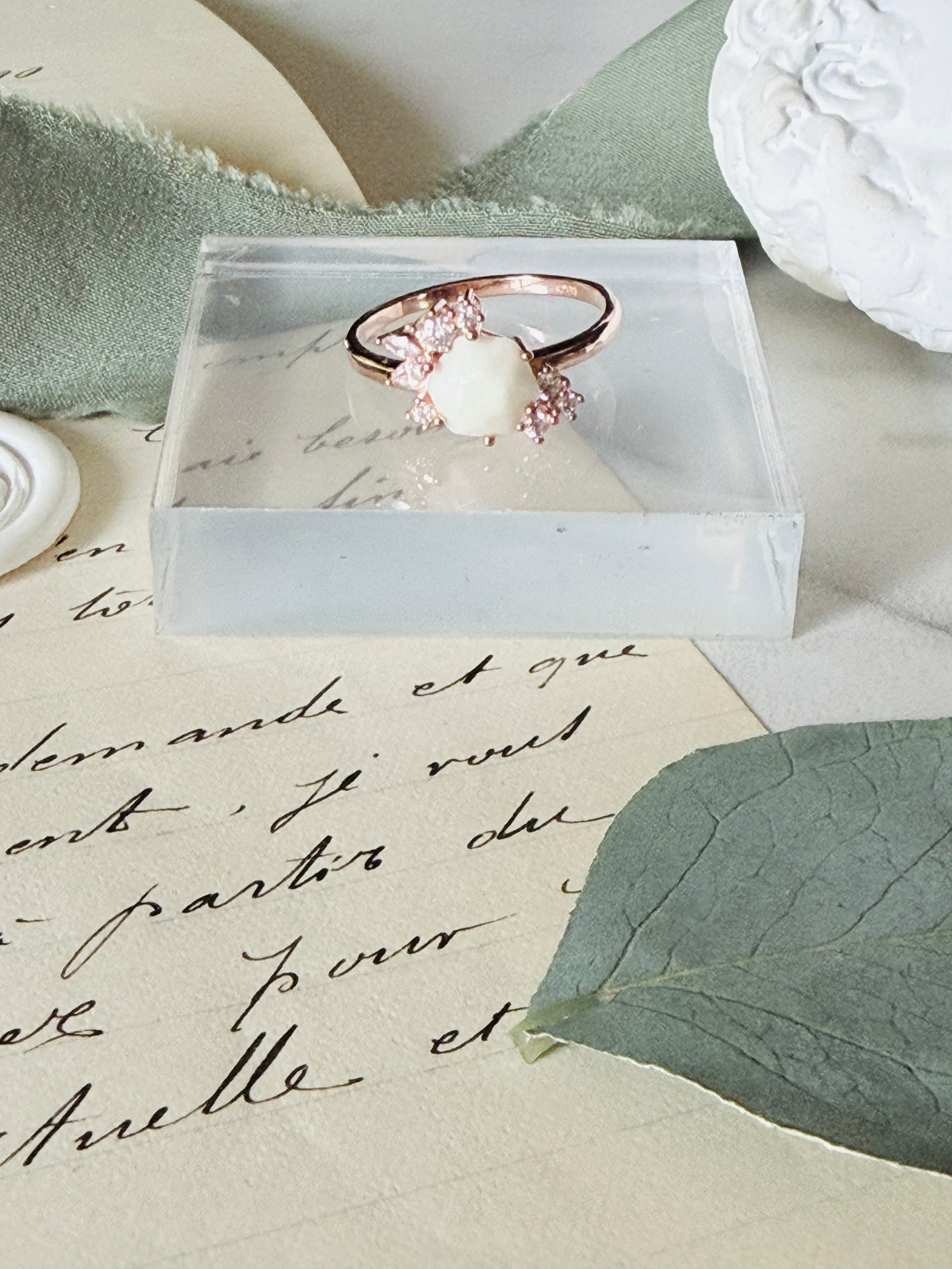The geometric setting highlights the uniqueness of the memorial stone while the moissanite accents add subtle radiance, creating a piece that feels both vintage and modern. Delicate yet striking, this ring is designed to honor life’s most meaningful moments in a way that will be cherished for generations.